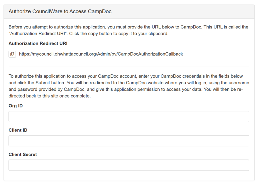 You must first provide a URL from CouncilWare to the CampDoc team. This is called the Authorization Redirect URI. Its just an internet link. Click the <copy> button to copy it to your clipboard and then you can paste it in an email to send to your CampDoc representative. Its not a secret value, so don't worry about sending it via email. The CampDoc team must enter this into their system before you can do Part 2. Do not start Part 2 until you get confirmation from CampDoc that they have received and entered this URL into their system.
