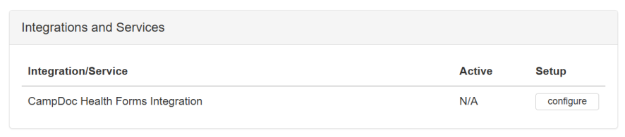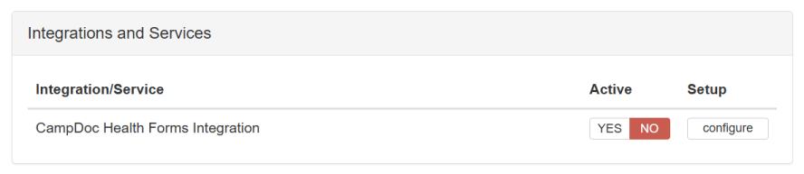 After CampDoc authorization is complete, you need to enable CampDoc for each of the events you want to use it with. By default, CampDoc integration is DISABLED for each event and you must turn it on only for the events you need it for. To enable and configure CampDoc for a specific event, go into Setup Registration for that particular event. This obviously has to be done by someone who has the authority to setup registrations in CouncilWare. From the Setup Registration page, for your event, click into the Other tab. There is a panel on that page titled, Integrations and Services, and in that panel will be a line titled, CampDoc Health Forms Integration. Click the <configure> button associated with this item.