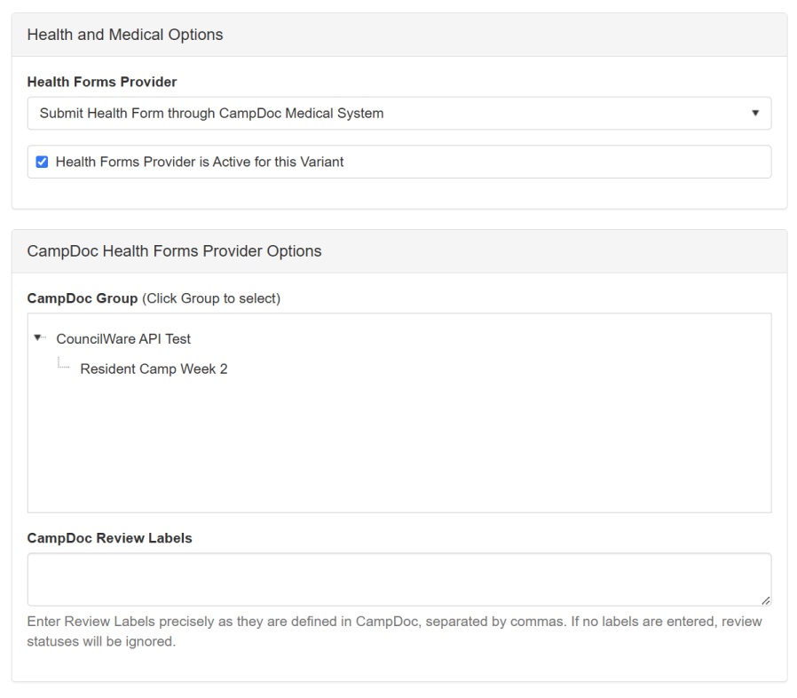 The next step in event setup, is configuring your Variants. Each Variant may have an independent health forms requirement. Some attendee types may require to only bring a health form whereas others may require connection to CampDoc. This is achieved by adjusting the Health and Medical Options for each Variant. To do this, edit each of your attendee Variants, in the Setup Registration dialog and click into the Other tab. There will be a panel titled, Health and Medical Options. In that panel set the Health Forms Provider. To connect the Variant to CampDoc, select the option "Submit Health Form through CampDoc Medical System". Once you choose this option, several other fields will appear. These are a checkbox to control whether the CampDoc system is Active for this Variant. If the box is not checked, your attendees of this Variant will not be synced to the CampDoc system. Make sure this is turned on when you are ready to use it. It can be turned off at any time to stop syncing with CampDoc. Additionally, a new panel will appear titled "CampDoc Health Forms Provider Options" as shown below...