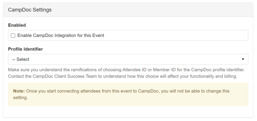 In the configuration dialog (shown below), click the checkbox to Enable CampDoc Integration for this Event. You then must select a Profile Identifier. Be sure you understand the ramifications of your choice for Profile Identifier. The Profile Identifier is the data element that uniquely identifies each CampDoc profile. Your two choices are...