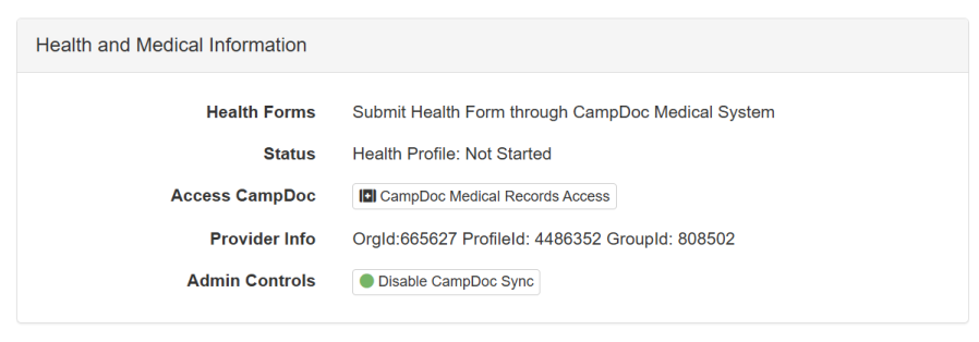 CampDoc data is directly related to your Attendees and as such, is shown in views of your Attendees, specifically in the Event, Attendee and Group DashBoards. Look for the Health and Medical Information panel in these Attendee views for CampDoc information. Not all information is always shown. Data shown is dependent upon who is viewing the Attendee.